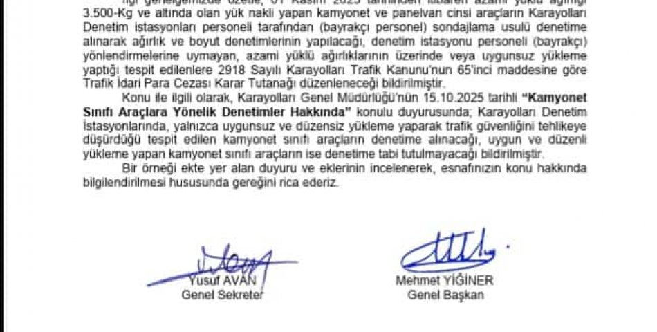 Kamyonetlerin 1 Kasım'dan itibaren kantara çekilmesi bu genelgeyle durdurulmuştur